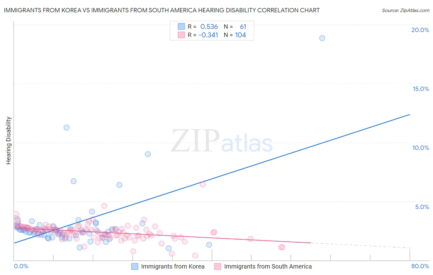 Immigrants from Korea vs Immigrants from South America Hearing Disability Correlation Chart