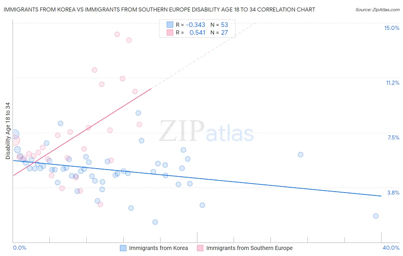 Immigrants from Korea vs Immigrants from Southern Europe Disability Age 18 to 34 Correlation Chart