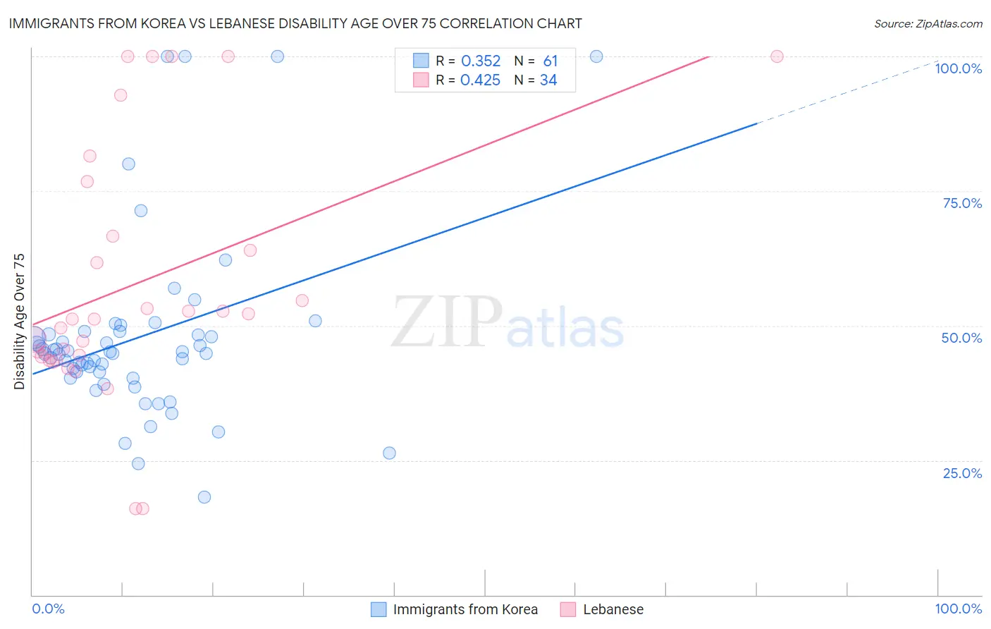 Immigrants from Korea vs Lebanese Disability Age Over 75 Correlation Chart
