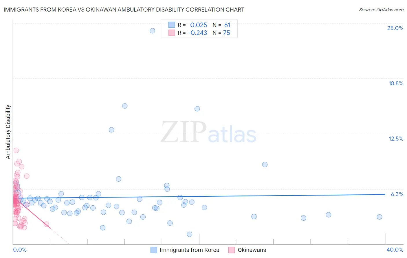 The statistical analysis conducted on geographies consisting of 416,118,040 people shows no correlation between the proportion of Immigrants from Korea and percentage of population with ambulatory disability in the United States with a correlation coefficient (R) of 0.025 and weighted average of 5.2%. Similarly, the statistical analysis conducted on geographies consisting of 73,734,691 people shows a weak negative correlation between the proportion of Okinawans and percentage of population with ambulatory disability in the United States with a correlation coefficient (R) of -0.243 and weighted average of 5.3%, a difference of 0.31%.