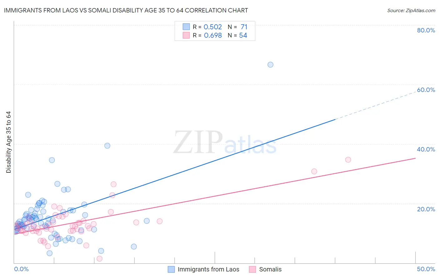 Immigrants from Laos vs Somali Disability Age 35 to 64 Correlation Chart