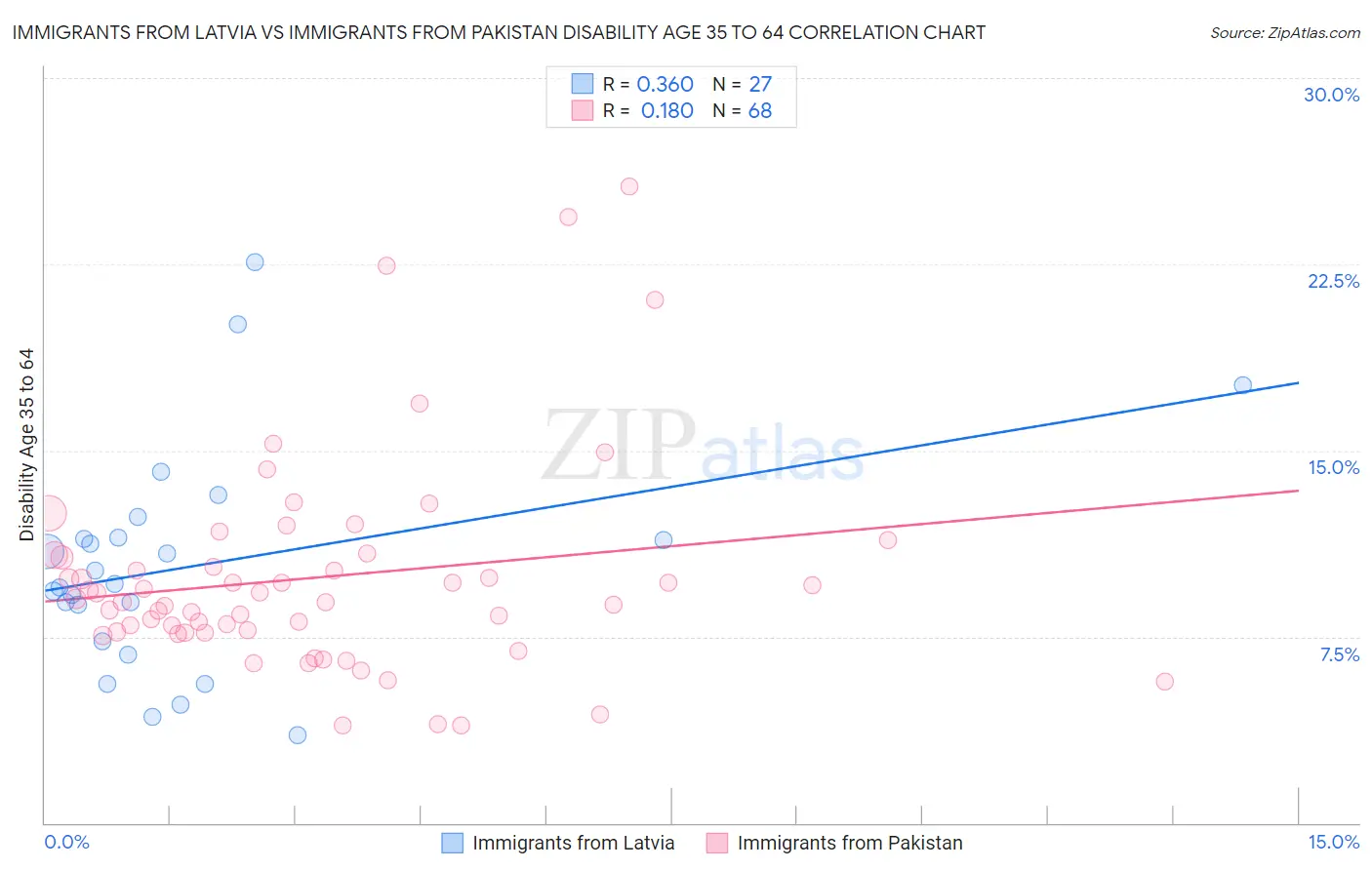 Immigrants from Latvia vs Immigrants from Pakistan Disability Age 35 to 64 Correlation Chart
