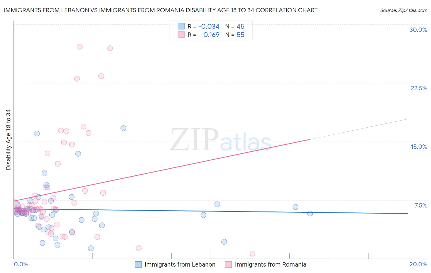 Immigrants from Lebanon vs Immigrants from Romania Disability Age 18 to 34 Correlation Chart