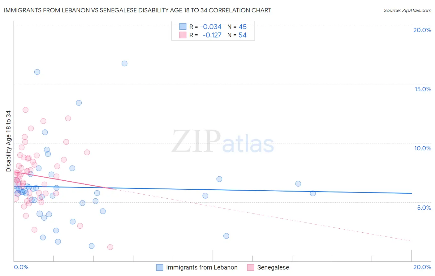 Immigrants from Lebanon vs Senegalese Disability Age 18 to 34 Correlation Chart