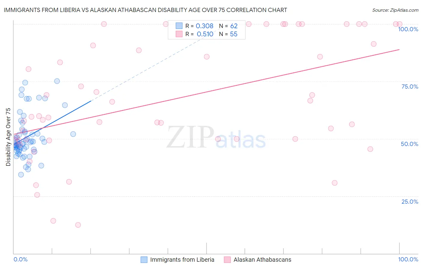 Immigrants from Liberia vs Alaskan Athabascan Disability Age Over 75 Correlation Chart