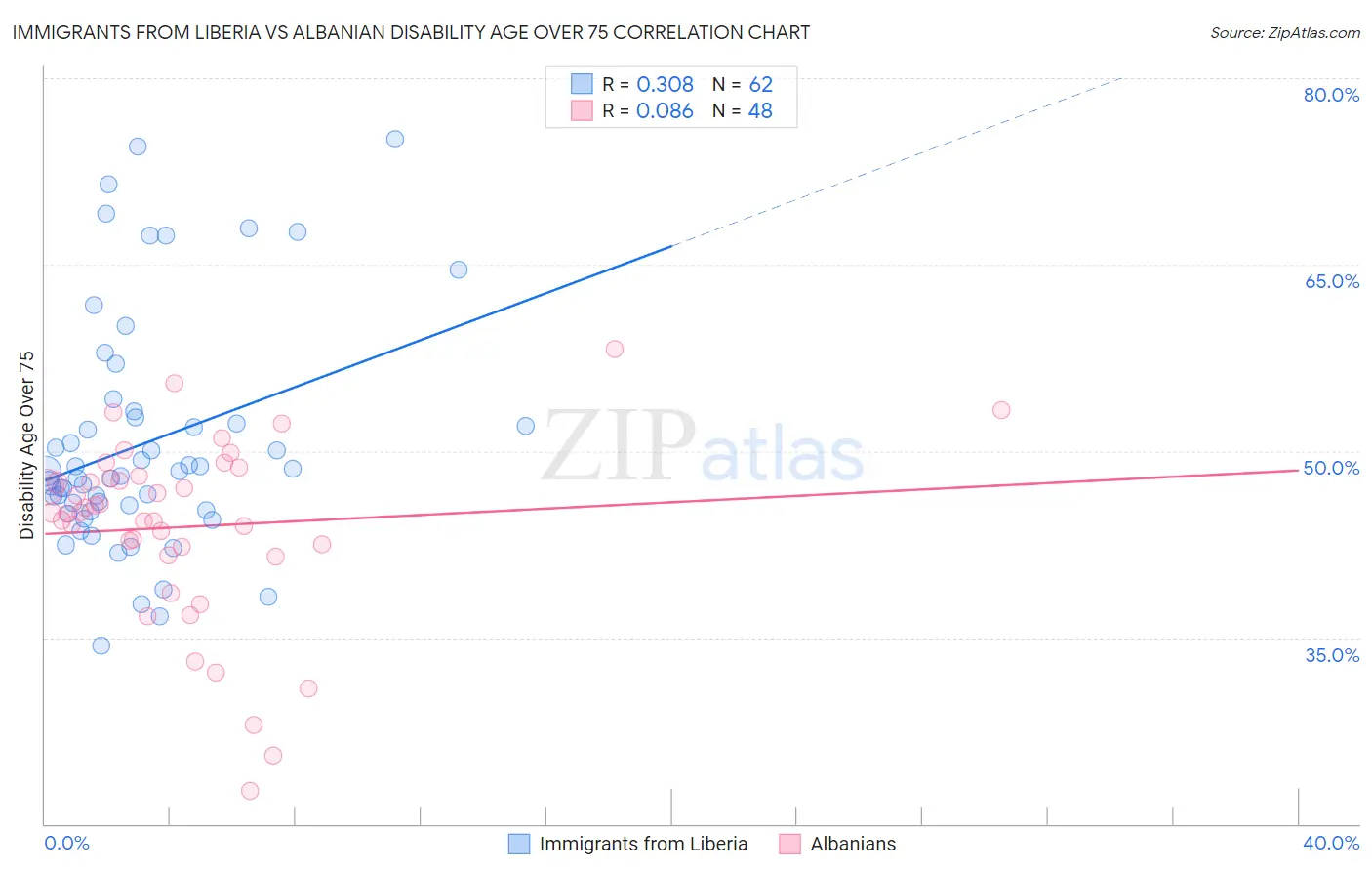 Immigrants from Liberia vs Albanian Disability Age Over 75 Correlation Chart