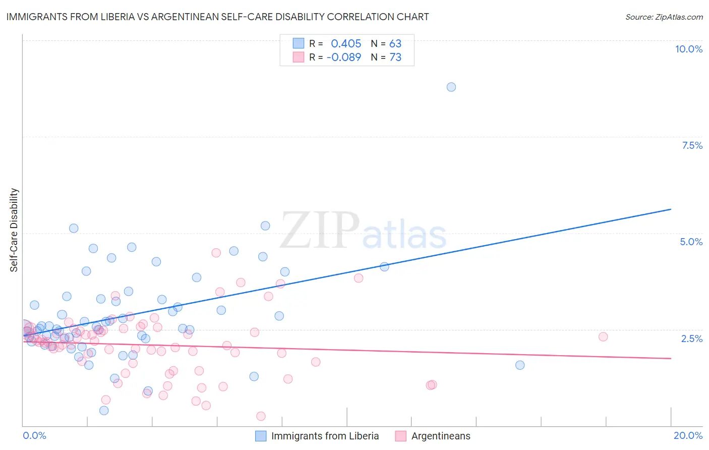 The statistical analysis conducted on geographies consisting of 135,176,274 people shows a moderate positive correlation between the proportion of Immigrants from Liberia and percentage of population with self-care disability in the United States with a correlation coefficient (R) of 0.405 and weighted average of 2.6%. Similarly, the statistical analysis conducted on geographies consisting of 296,904,932 people shows a slight negative correlation between the proportion of Argentineans and percentage of population with self-care disability in the United States with a correlation coefficient (R) of -0.089 and weighted average of 2.3%, a difference of 14.1%.