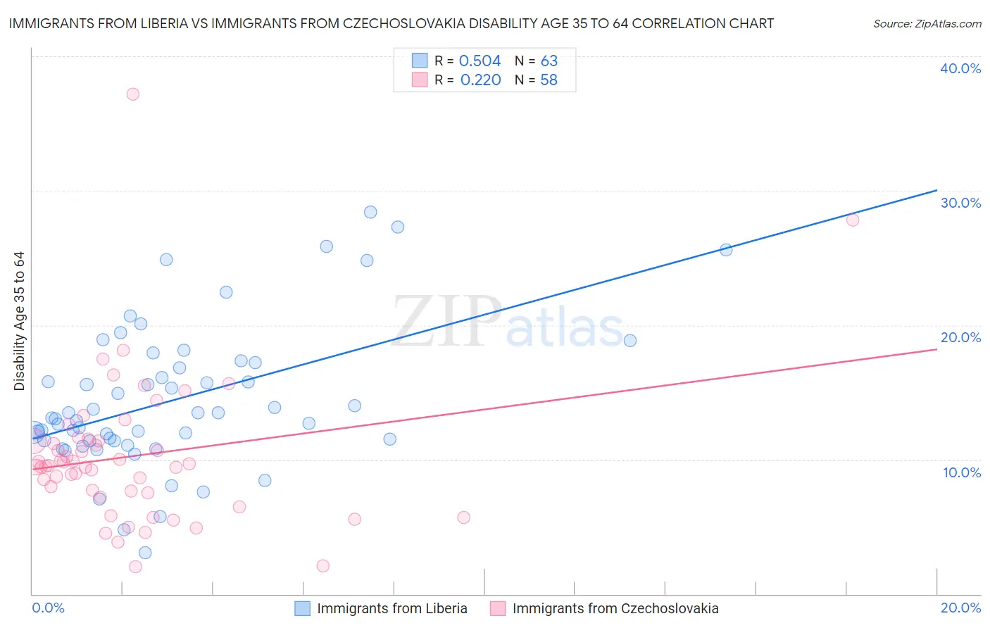 Immigrants from Liberia vs Immigrants from Czechoslovakia Disability Age 35 to 64 Correlation Chart
