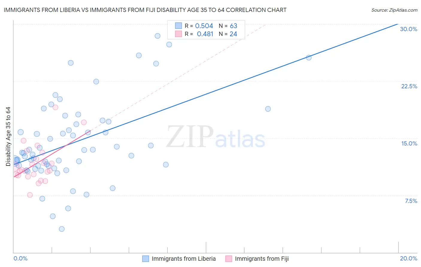 Immigrants from Liberia vs Immigrants from Fiji Disability Age 35 to 64 Correlation Chart