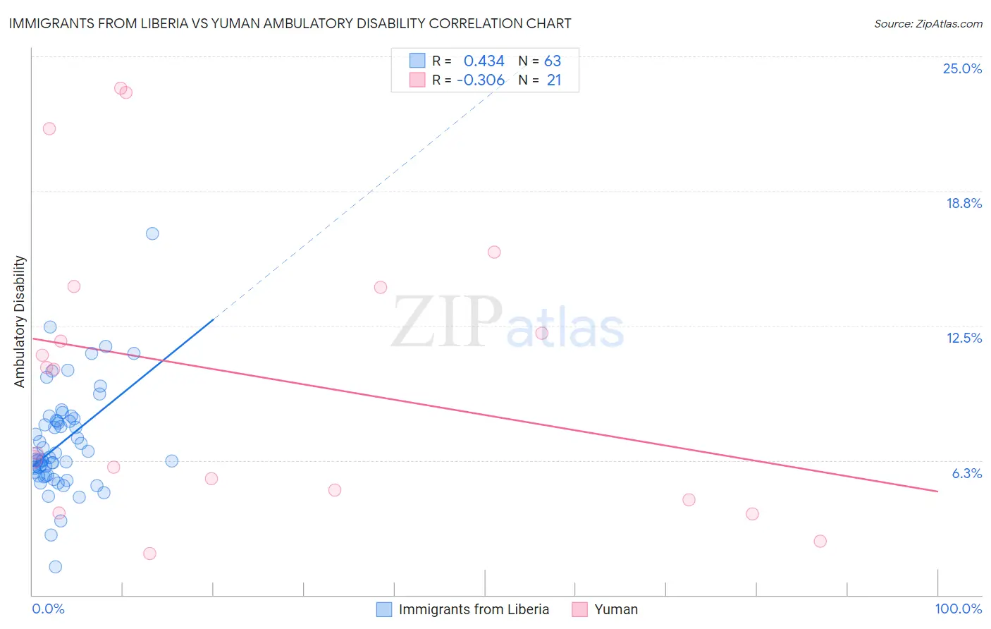 Immigrants from Liberia vs Yuman Ambulatory Disability Correlation Chart