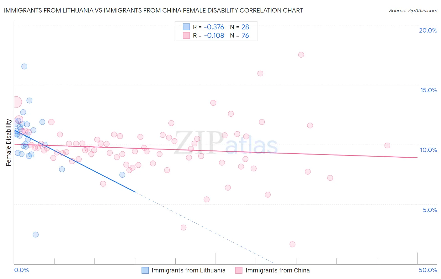 Immigrants from Lithuania vs Immigrants from China Female Disability Correlation Chart