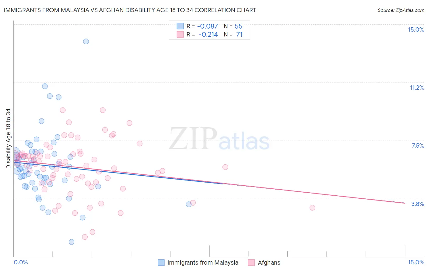 Immigrants from Malaysia vs Afghan Disability Age 18 to 34 Correlation Chart