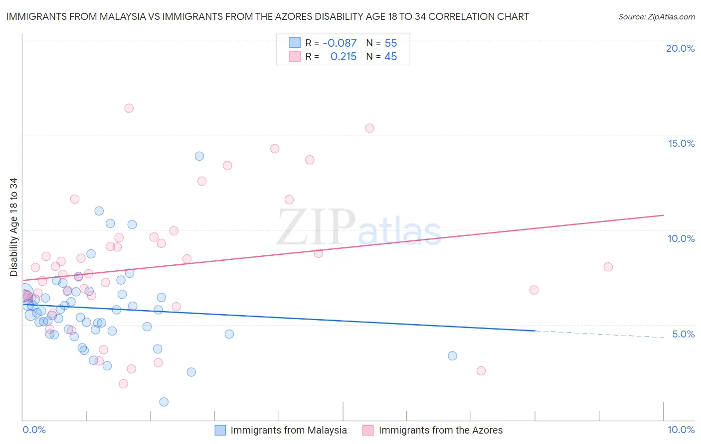 Immigrants from Malaysia vs Immigrants from the Azores Disability Age 18 to 34 Correlation Chart