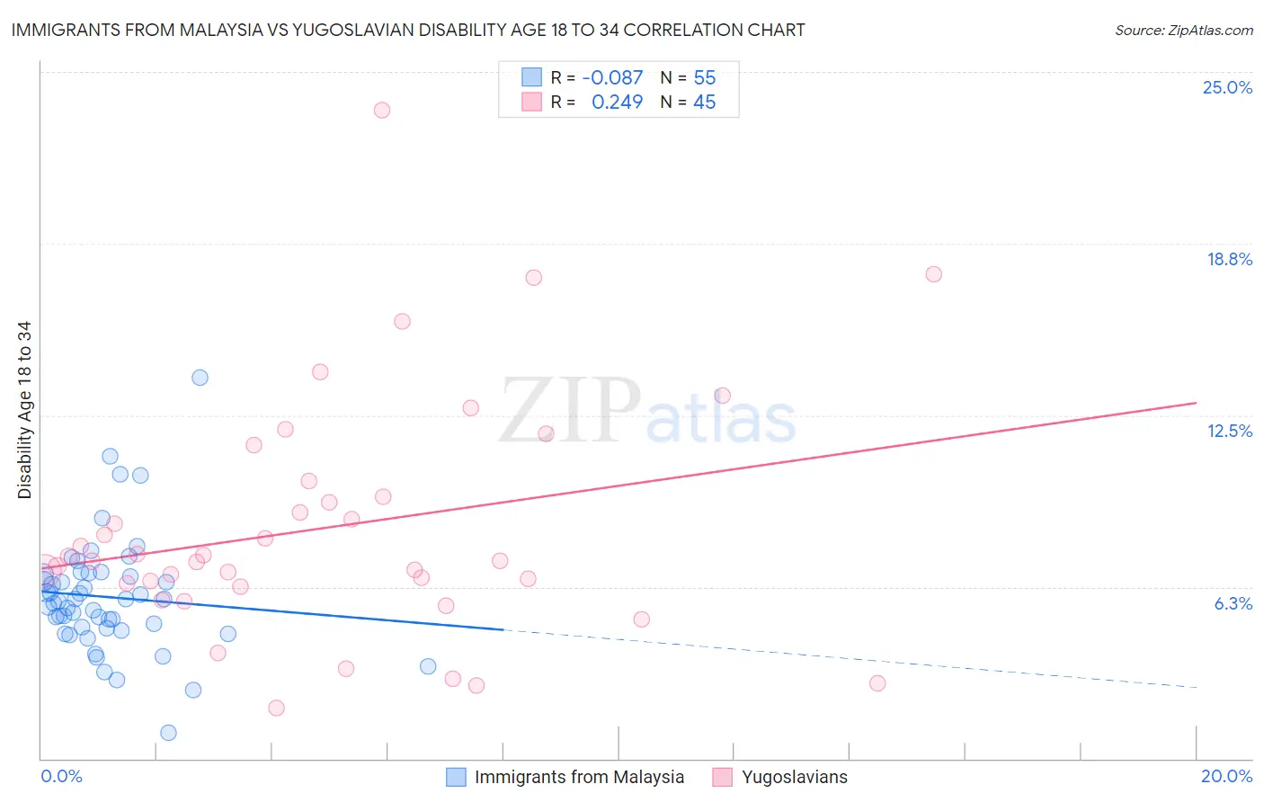 Immigrants from Malaysia vs Yugoslavian Disability Age 18 to 34 Correlation Chart