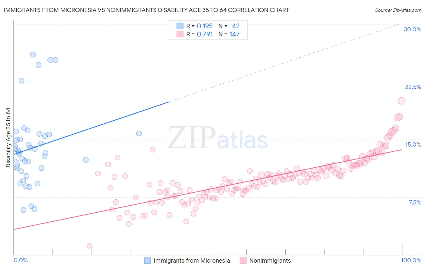 Immigrants from Micronesia vs Nonimmigrants Disability Age 35 to 64 Correlation Chart