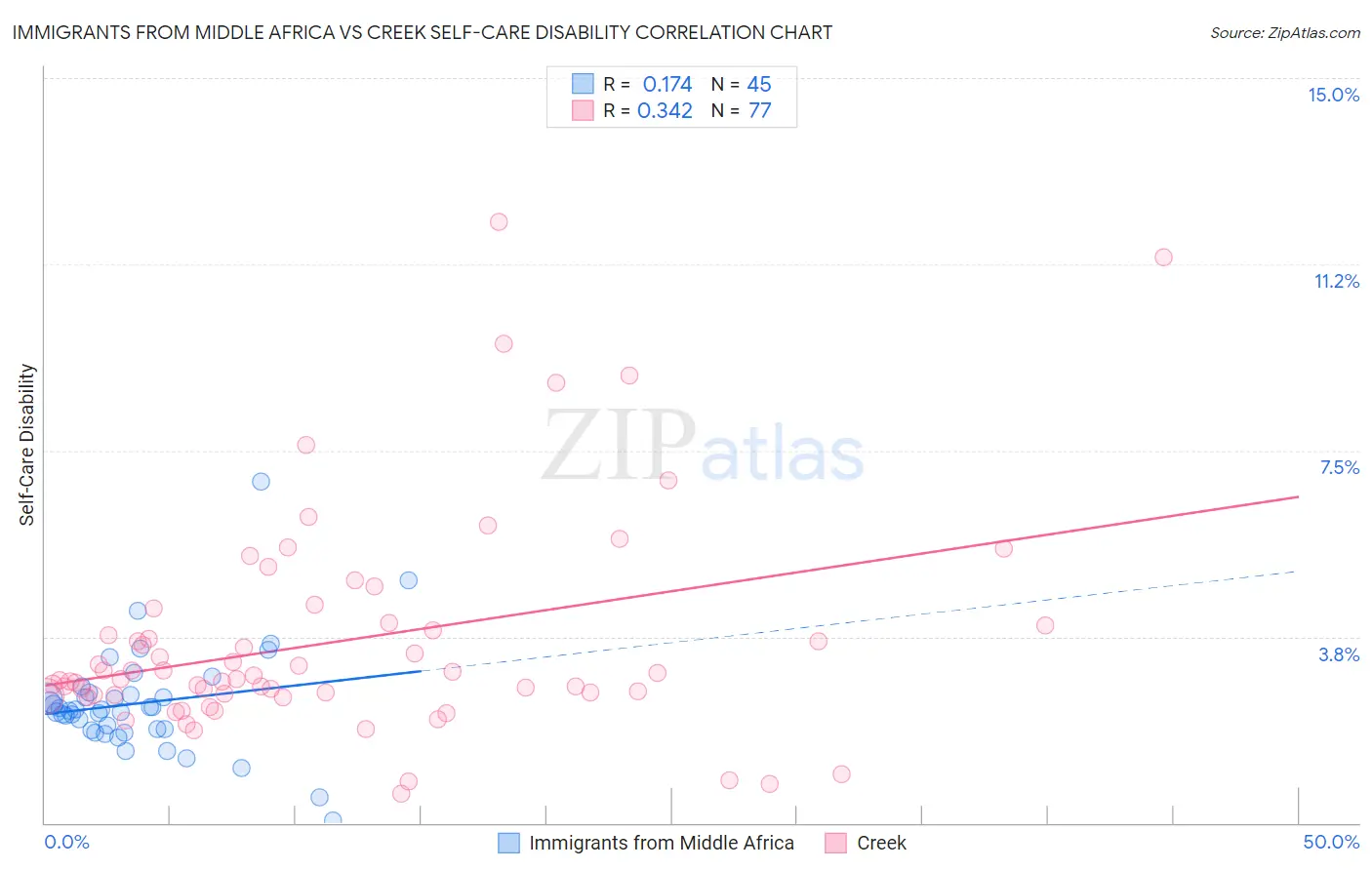 Immigrants from Middle Africa vs Creek Self-Care Disability Correlation Chart