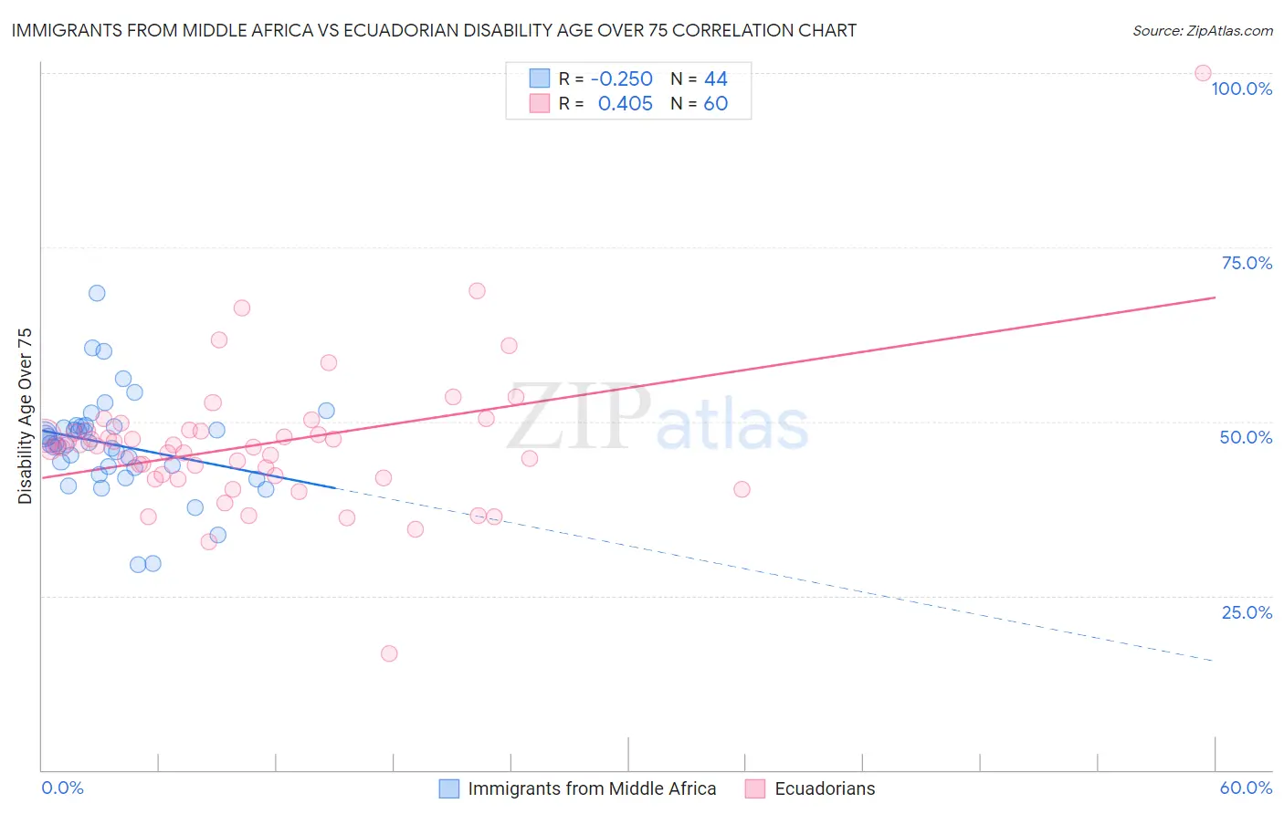 Immigrants from Middle Africa vs Ecuadorian Disability Age Over 75 Correlation Chart