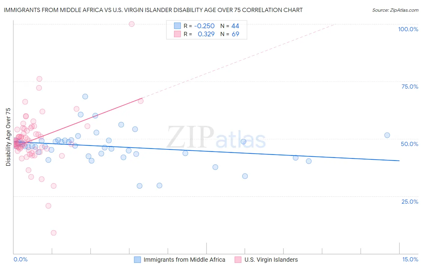 Immigrants from Middle Africa vs U.S. Virgin Islander Disability Age Over 75 Correlation Chart