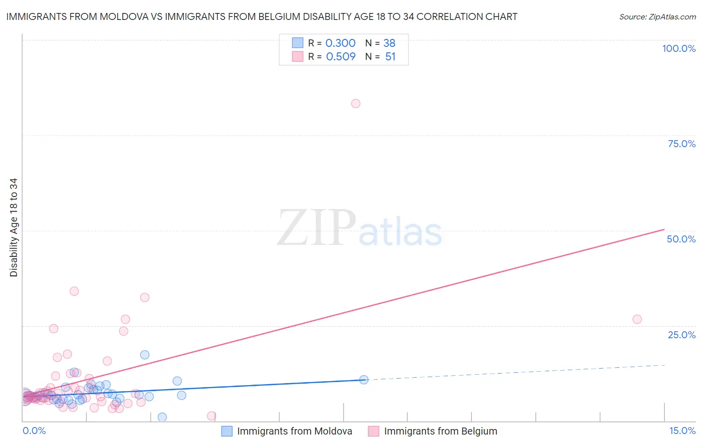 Immigrants from Moldova vs Immigrants from Belgium Disability Age 18 to 34 Correlation Chart