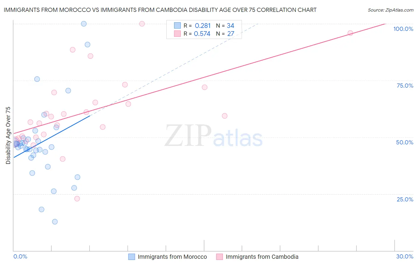 Immigrants from Morocco vs Immigrants from Cambodia Disability Age Over 75 Correlation Chart