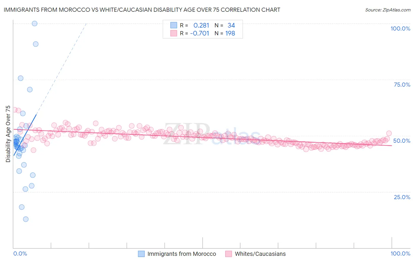 Immigrants from Morocco vs White/Caucasian Disability Age Over 75 Correlation Chart