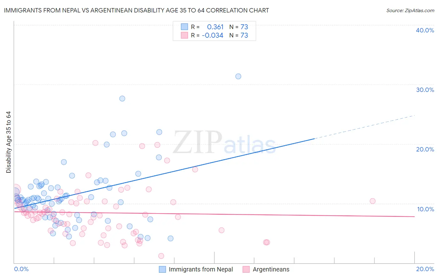 The statistical analysis conducted on geographies consisting of 186,686,012 people shows a mild positive correlation between the proportion of Immigrants from Nepal and percentage of population with a disability between the ages 34 and 64 in the United States with a correlation coefficient (R) of 0.361 and weighted average of 10.6%. Similarly, the statistical analysis conducted on geographies consisting of 296,962,722 people shows no correlation between the proportion of Argentineans and percentage of population with a disability between the ages 34 and 64 in the United States with a correlation coefficient (R) of -0.034 and weighted average of 9.4%, a difference of 12.5%.