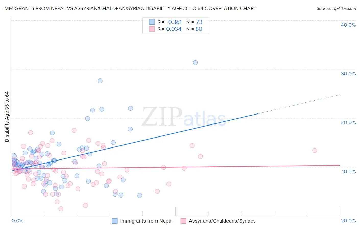 Immigrants from Nepal vs Assyrian/Chaldean/Syriac Disability Age 35 to 64 Correlation Chart