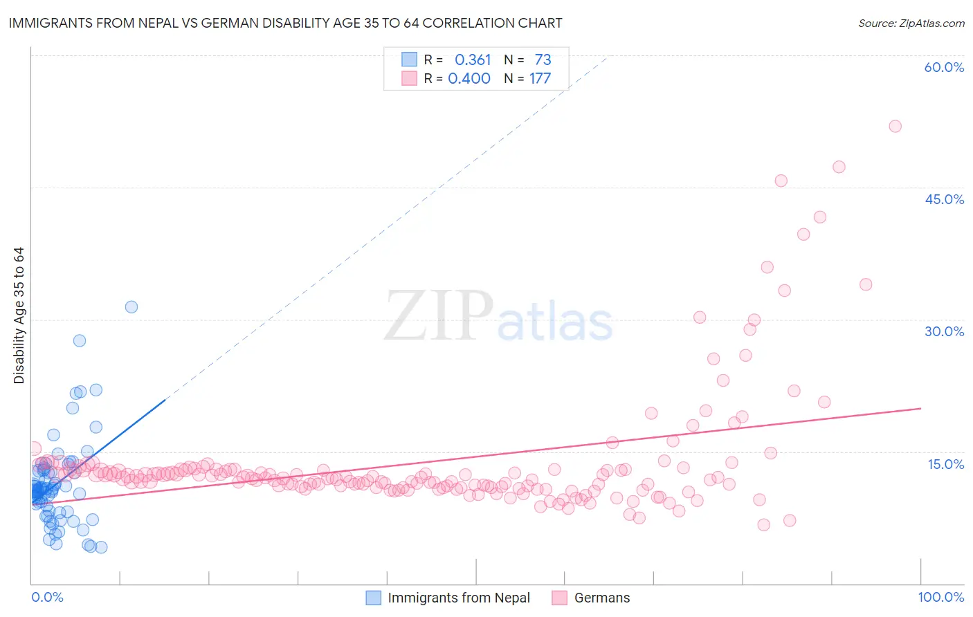 Immigrants from Nepal vs German Disability Age 35 to 64 Correlation Chart