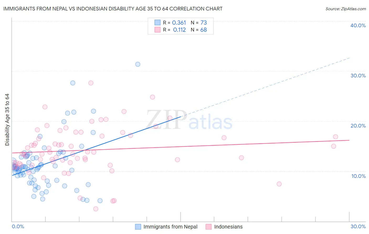 Immigrants from Nepal vs Indonesian Disability Age 35 to 64 Correlation Chart