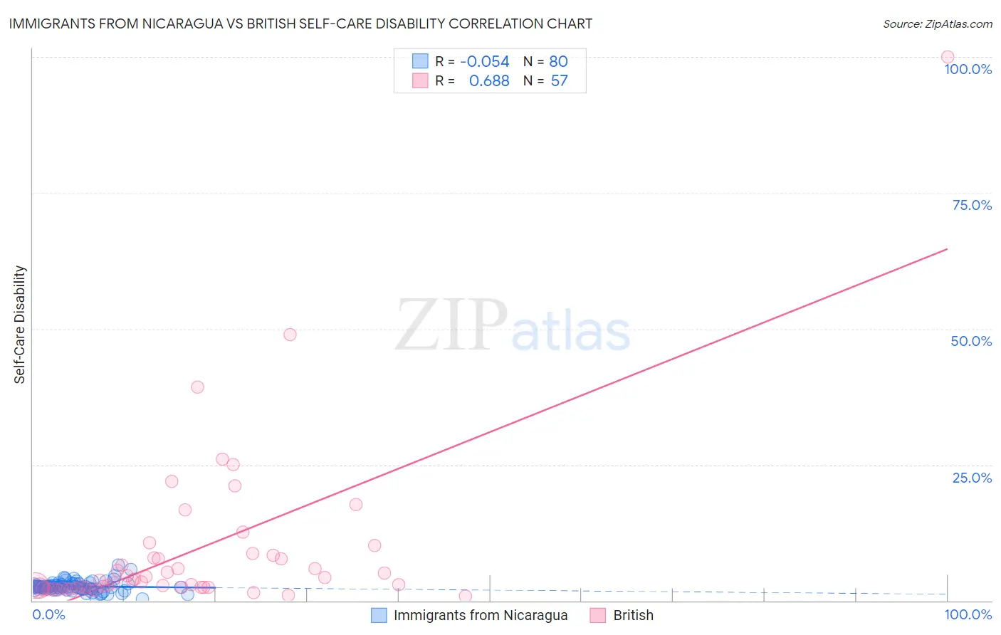 Immigrants from Nicaragua vs British Self-Care Disability Correlation Chart
