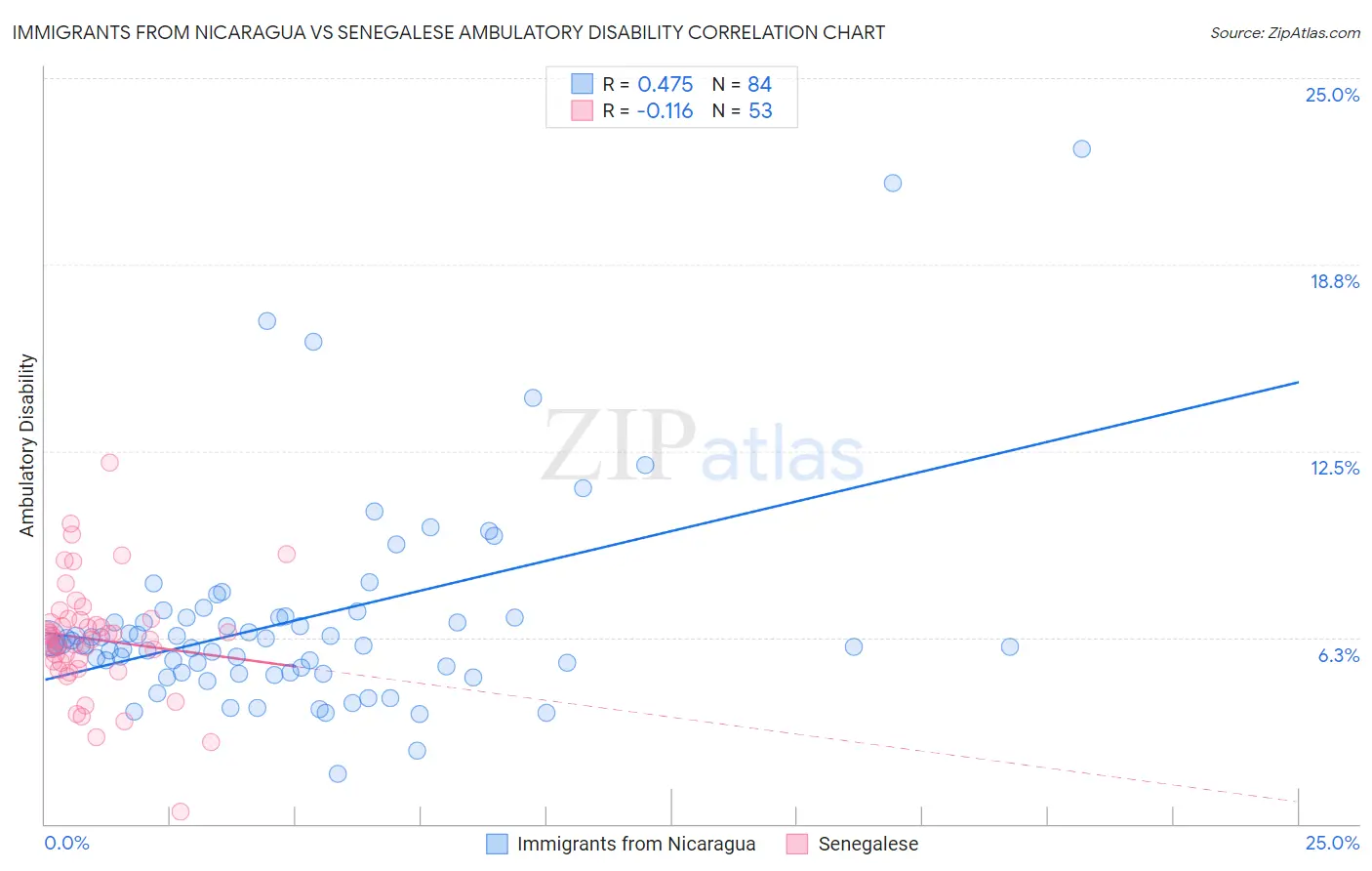 Immigrants from Nicaragua vs Senegalese Ambulatory Disability Correlation Chart