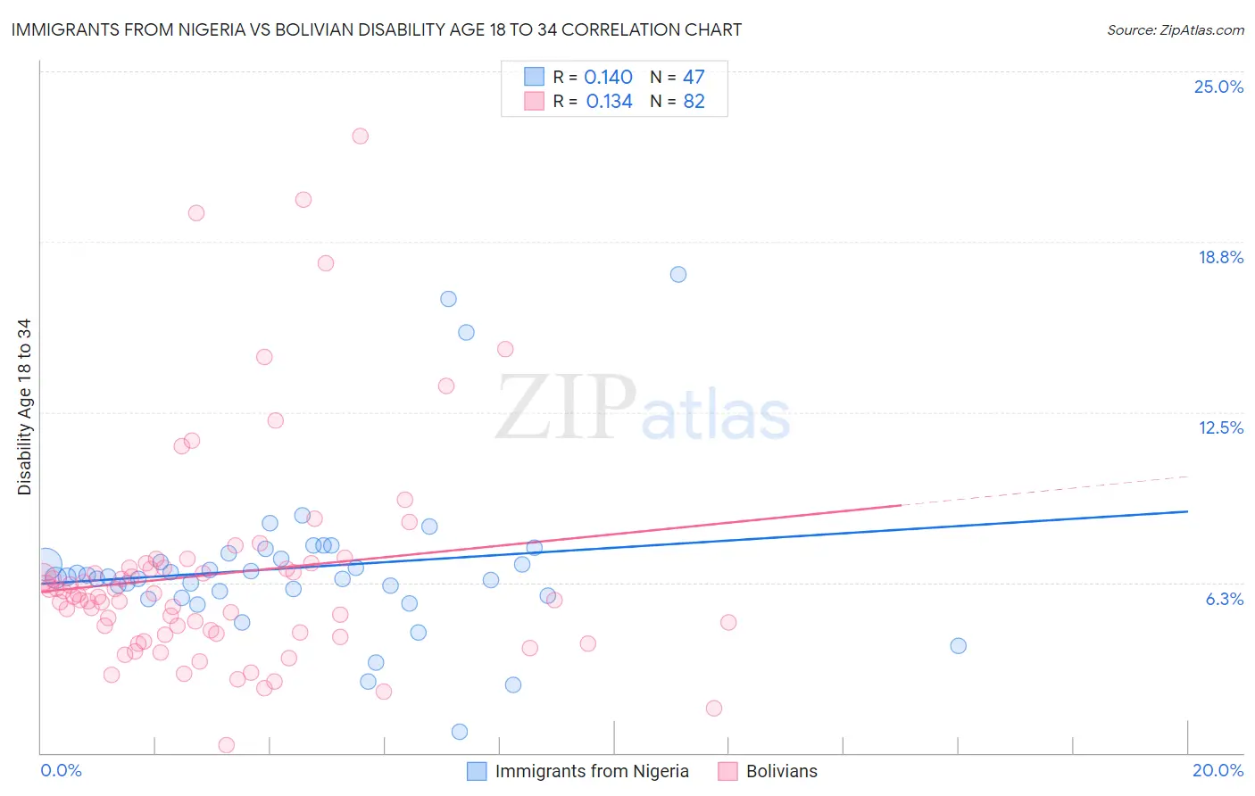 Immigrants from Nigeria vs Bolivian Disability Age 18 to 34 Correlation Chart