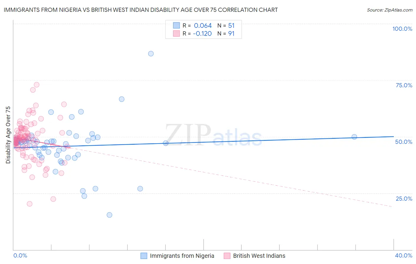 Immigrants from Nigeria vs British West Indian Disability Age Over 75 Correlation Chart