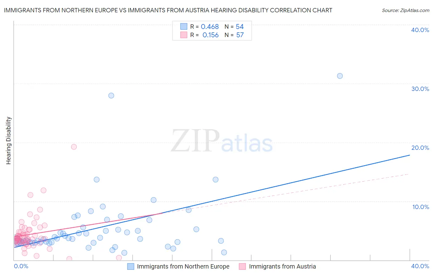 Immigrants from Northern Europe vs Immigrants from Austria Hearing Disability Correlation Chart