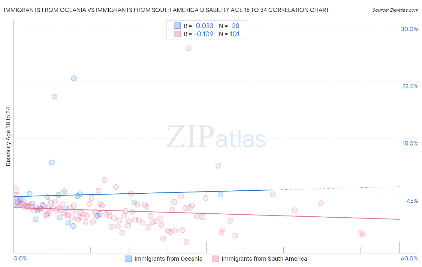 Immigrants from Oceania vs Immigrants from South America Disability Age 18 to 34