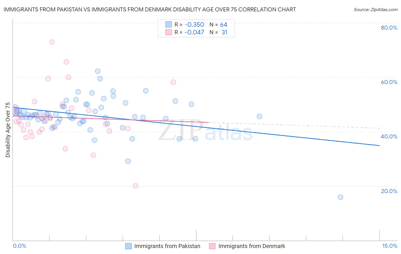 Immigrants from Pakistan vs Immigrants from Denmark Disability Age Over 75 Correlation Chart