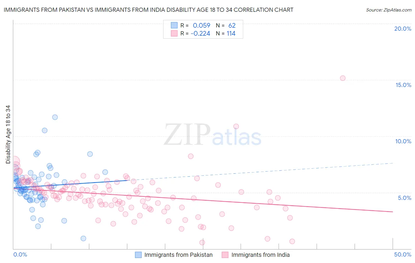 Immigrants from Pakistan vs Immigrants from India Disability Age 18 to 34 Correlation Chart