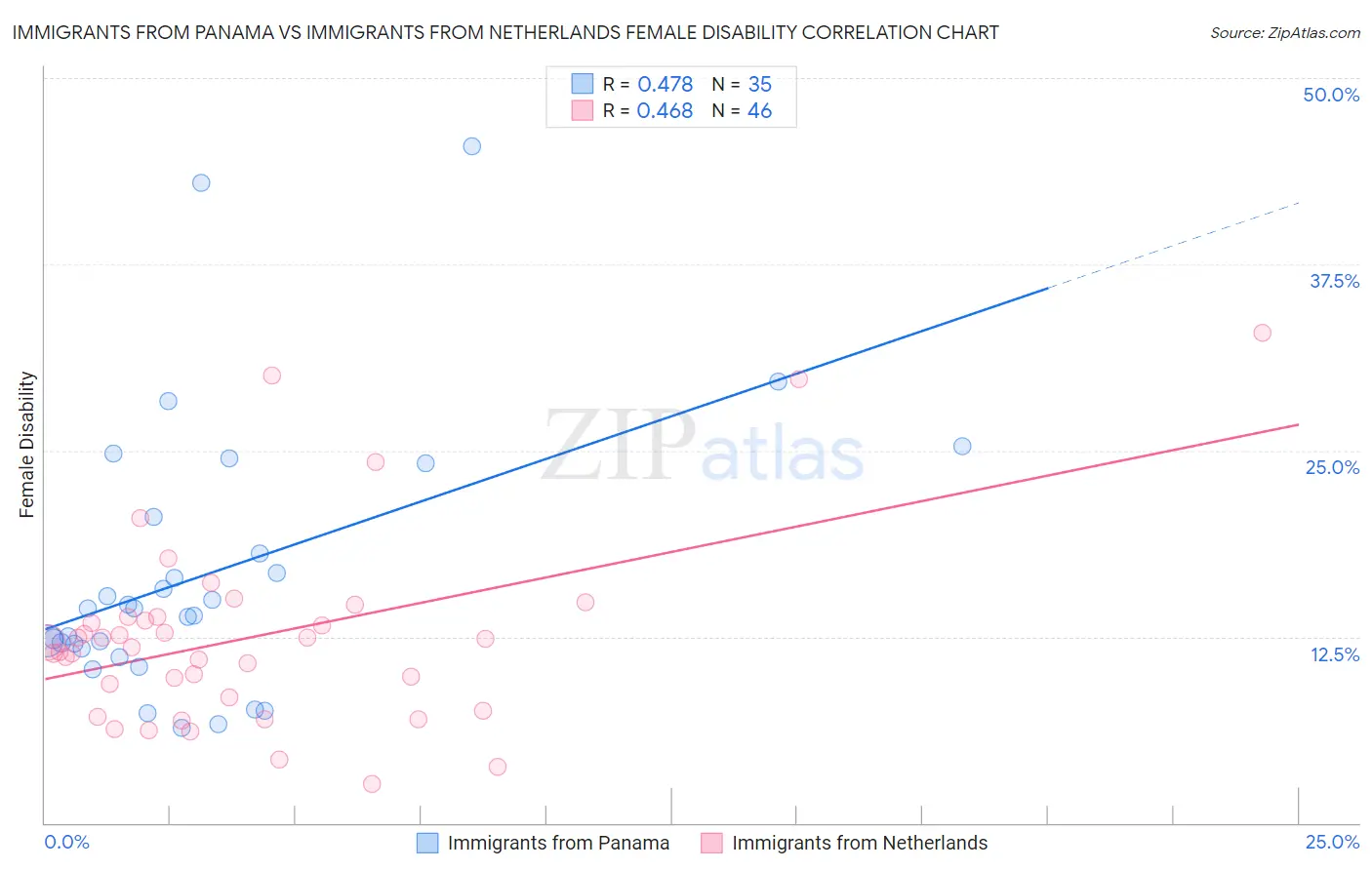 Immigrants from Panama vs Immigrants from Netherlands Female Disability Correlation Chart