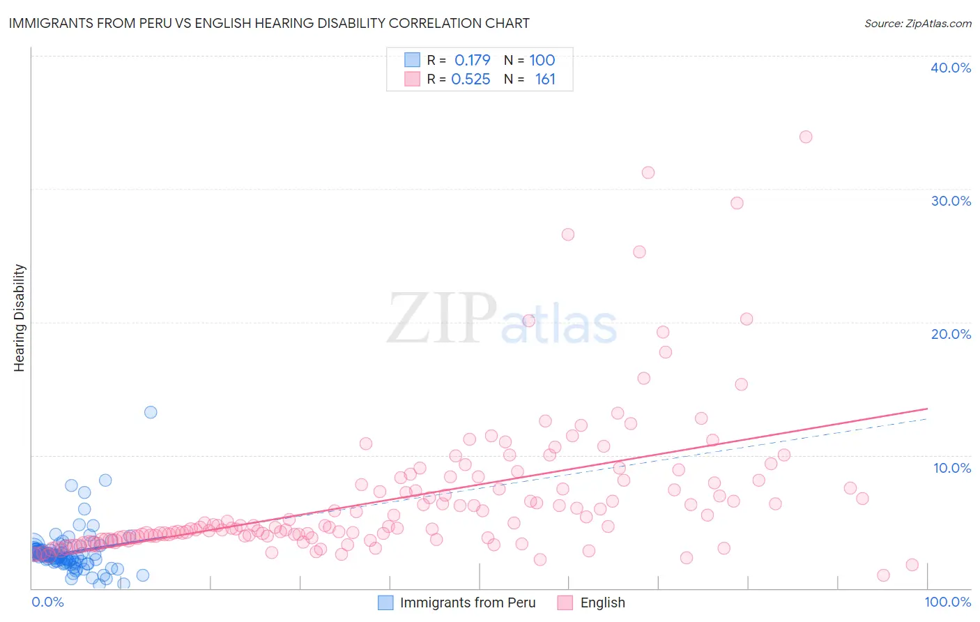 Immigrants from Peru vs English Hearing Disability Correlation Chart
