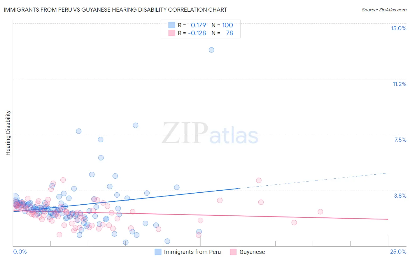 Immigrants from Peru vs Guyanese Hearing Disability Correlation Chart