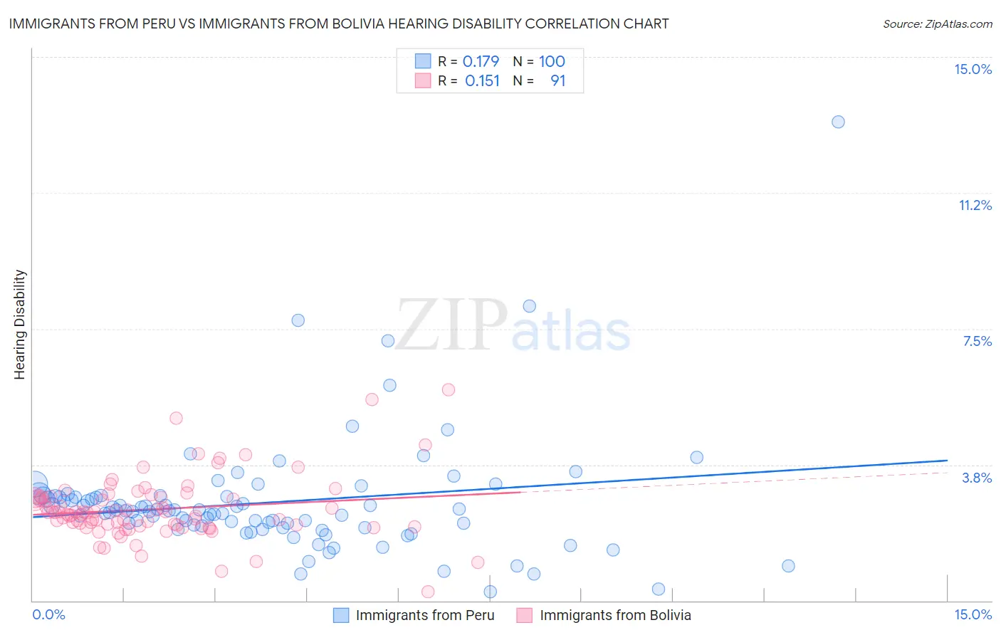 Immigrants from Peru vs Immigrants from Bolivia Hearing Disability Correlation Chart