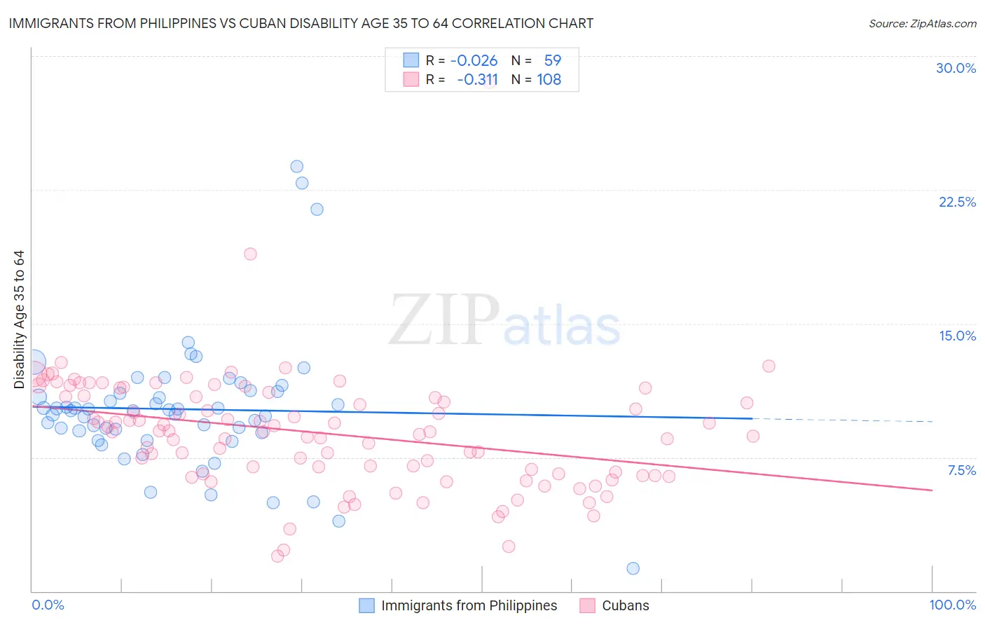 Immigrants from Philippines vs Cuban Disability Age 35 to 64 Correlation Chart