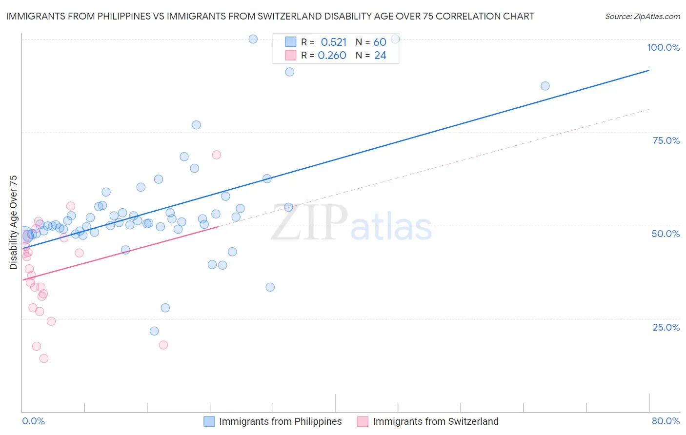 Immigrants from Philippines vs Immigrants from Switzerland Disability Age Over 75 Correlation Chart