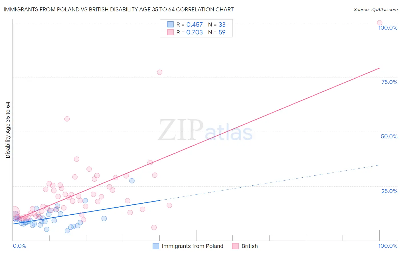 Immigrants from Poland vs British Disability Age 35 to 64 Correlation Chart