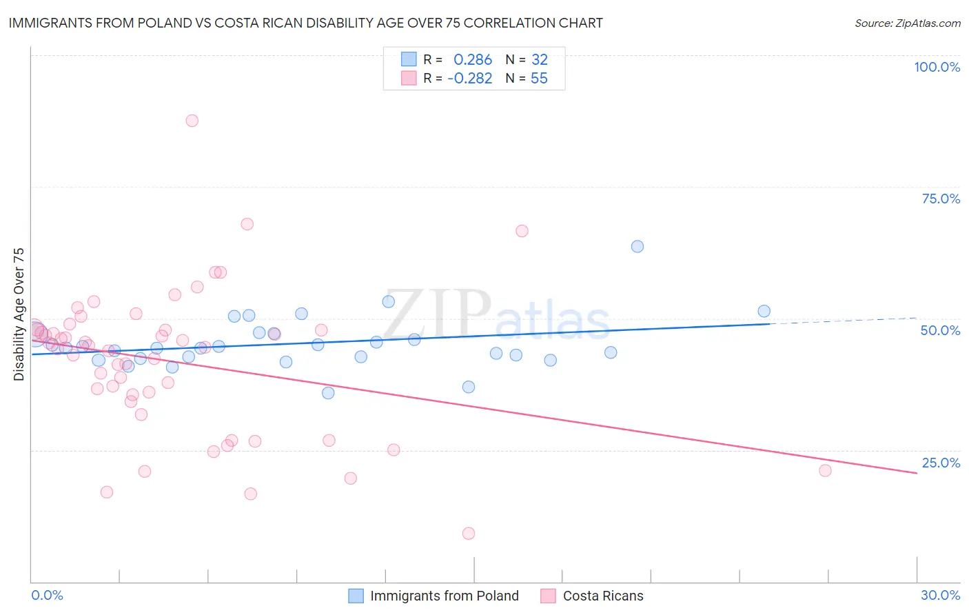 Immigrants from Poland vs Costa Rican Disability Age Over 75 Correlation Chart