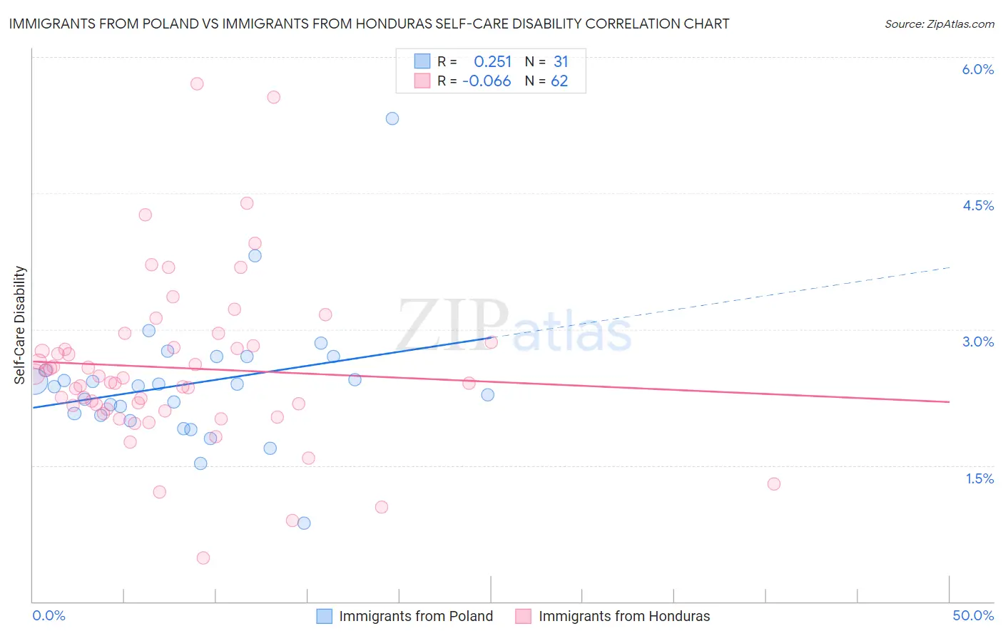 Immigrants from Poland vs Immigrants from Honduras Self-Care Disability Correlation Chart