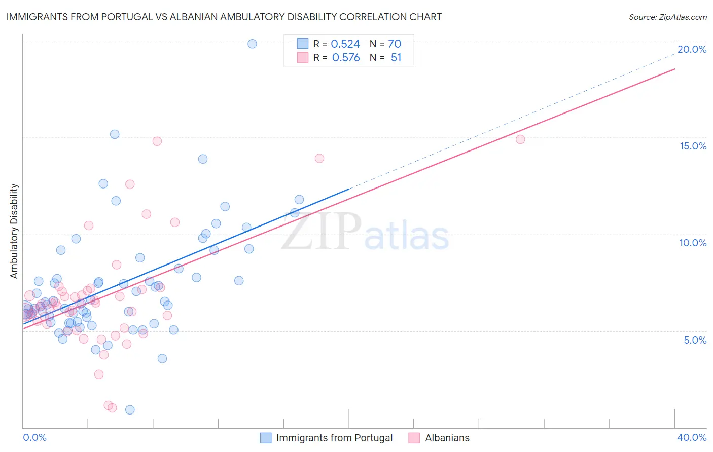 Immigrants from Portugal vs Albanian Ambulatory Disability Correlation Chart