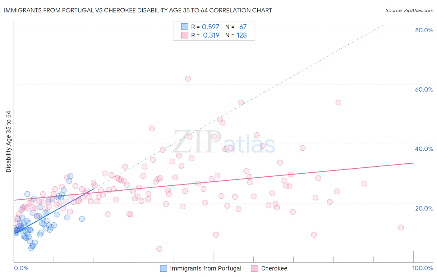Immigrants from Portugal vs Cherokee Disability Age 35 to 64 Correlation Chart