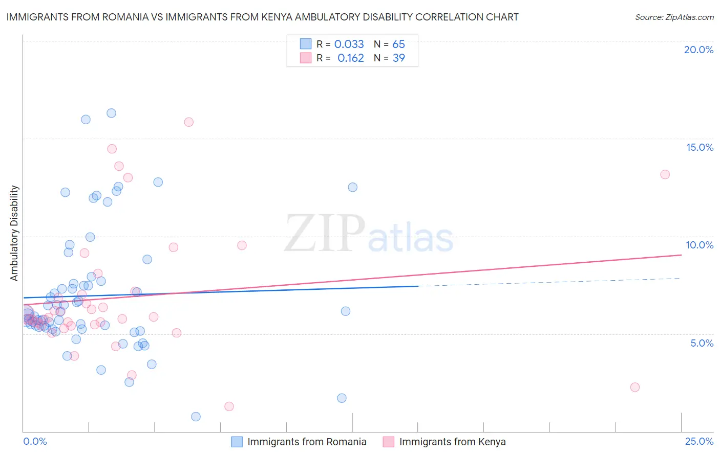 Immigrants from Romania vs Immigrants from Kenya Ambulatory Disability Correlation Chart