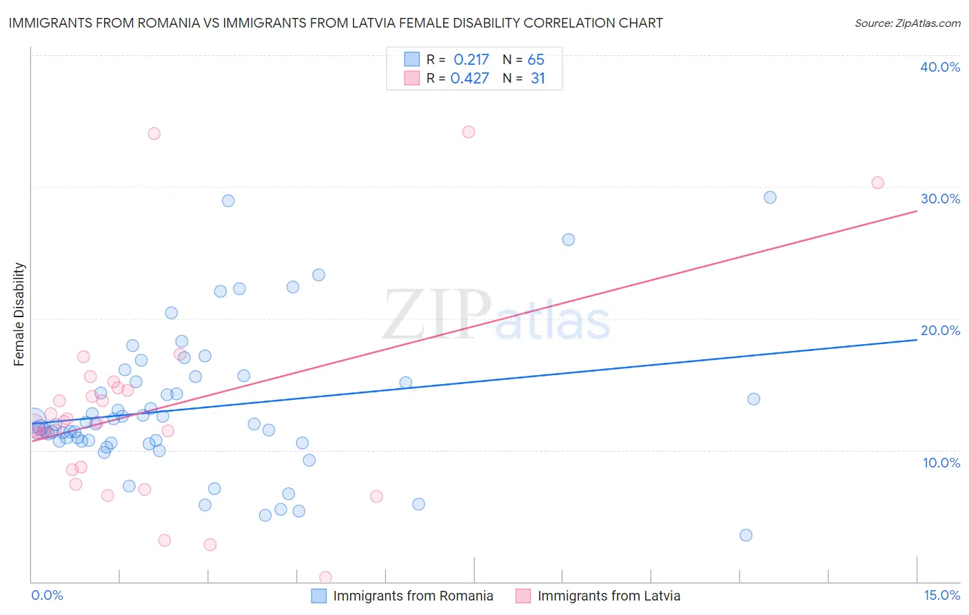 Immigrants from Romania vs Immigrants from Latvia Female Disability Correlation Chart